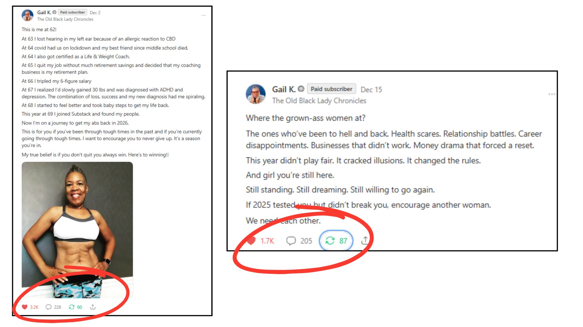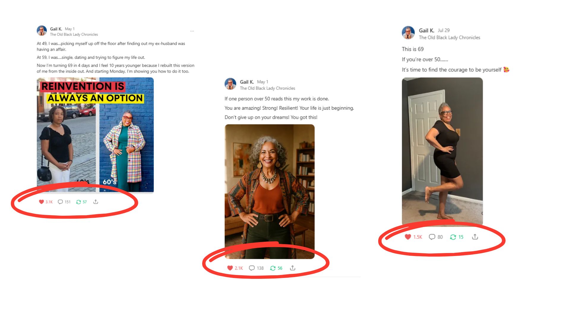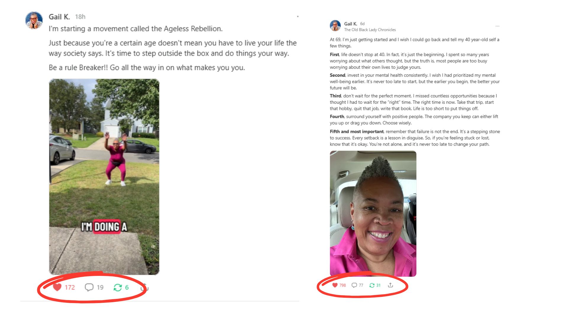 - Gail K. - 69yo, reinvention coach, viral Notes writer